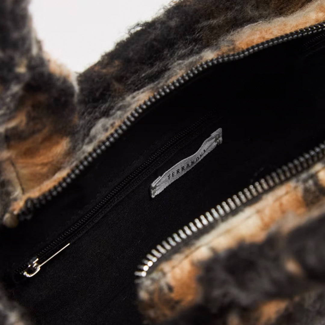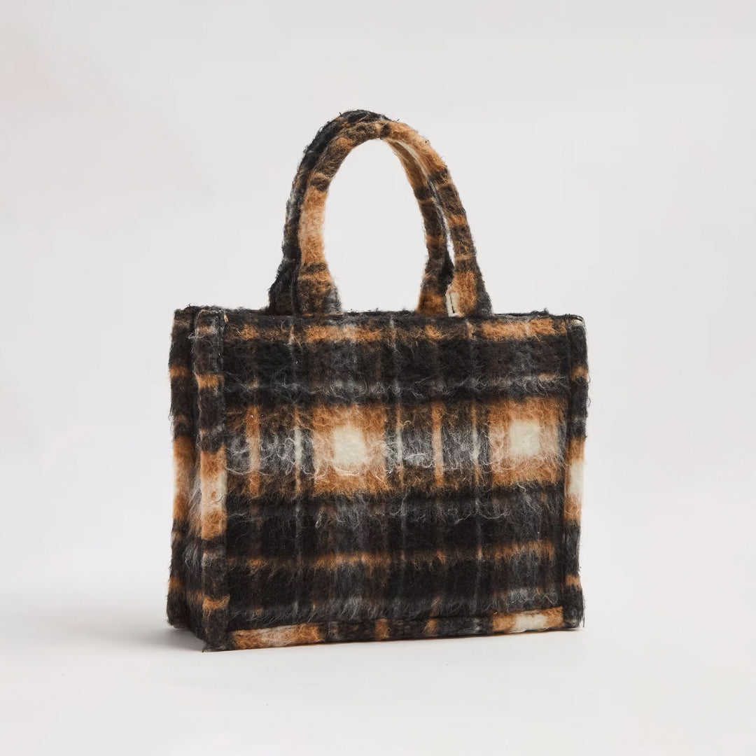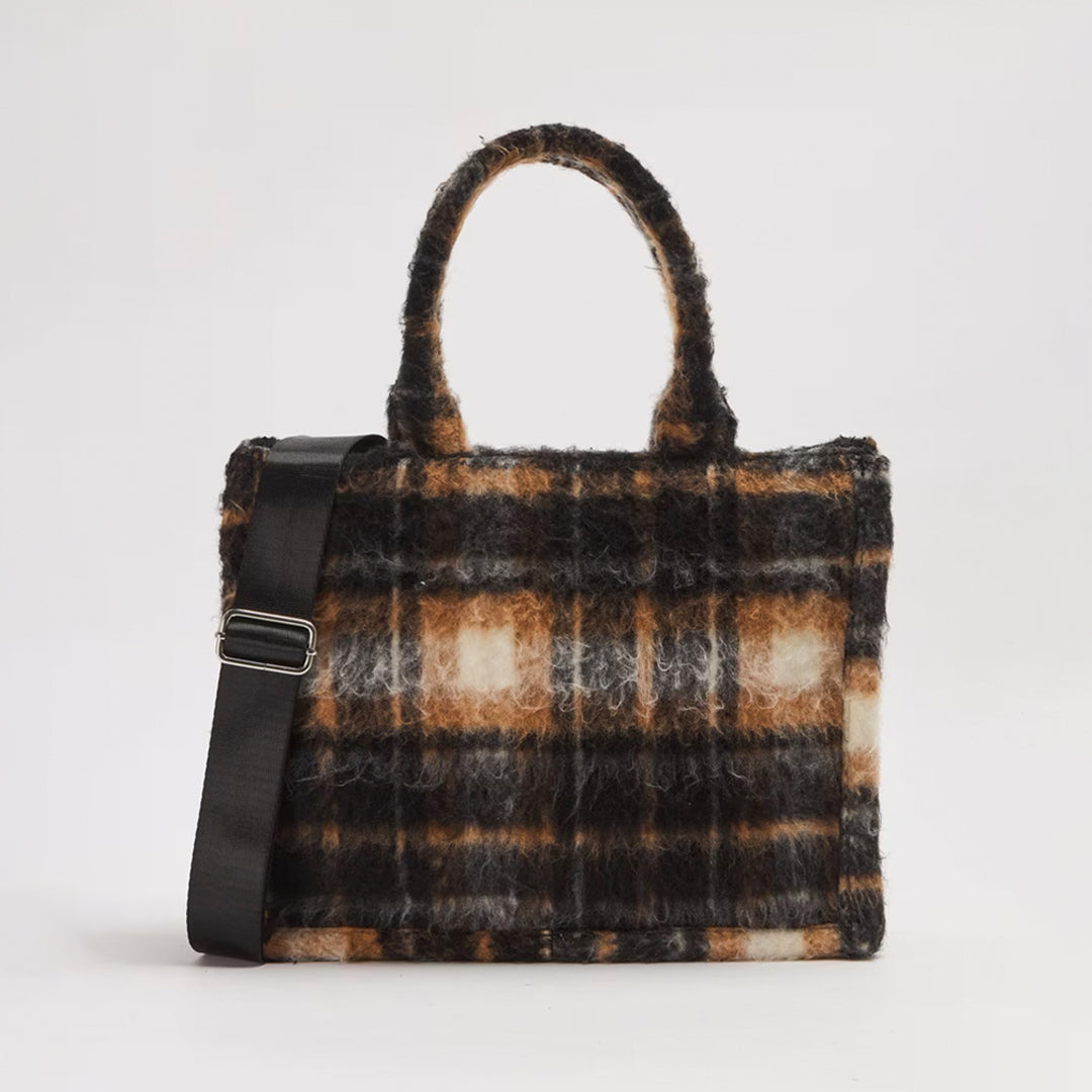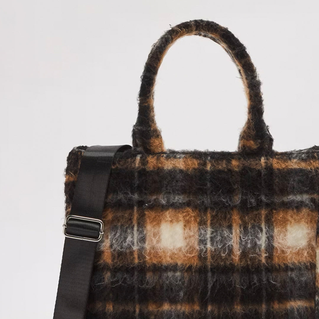 Shopper model in tweed fabric with hand handles and adjustable shoulder strap.