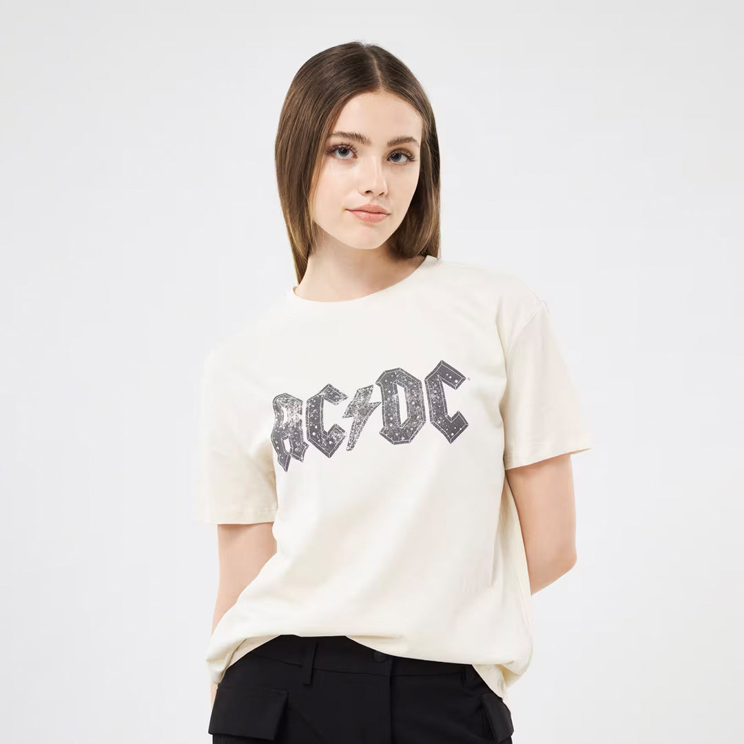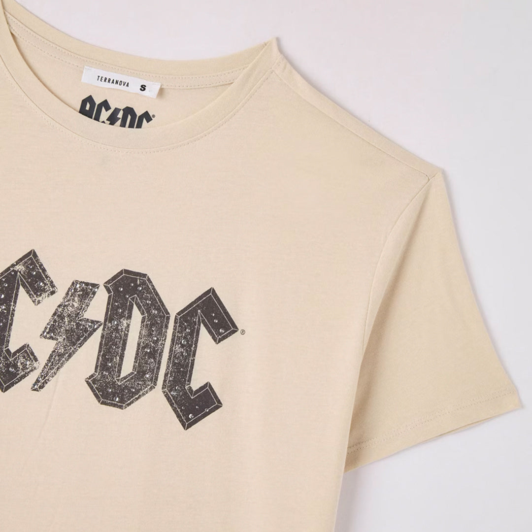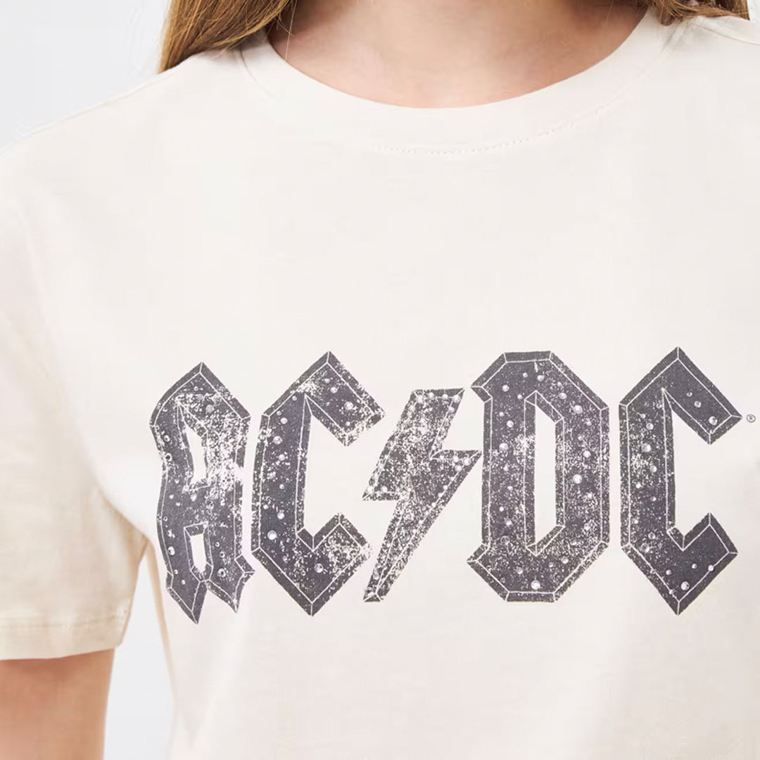 Women's crew-neck t-shirt with AC/DC print and rhinestone applications.