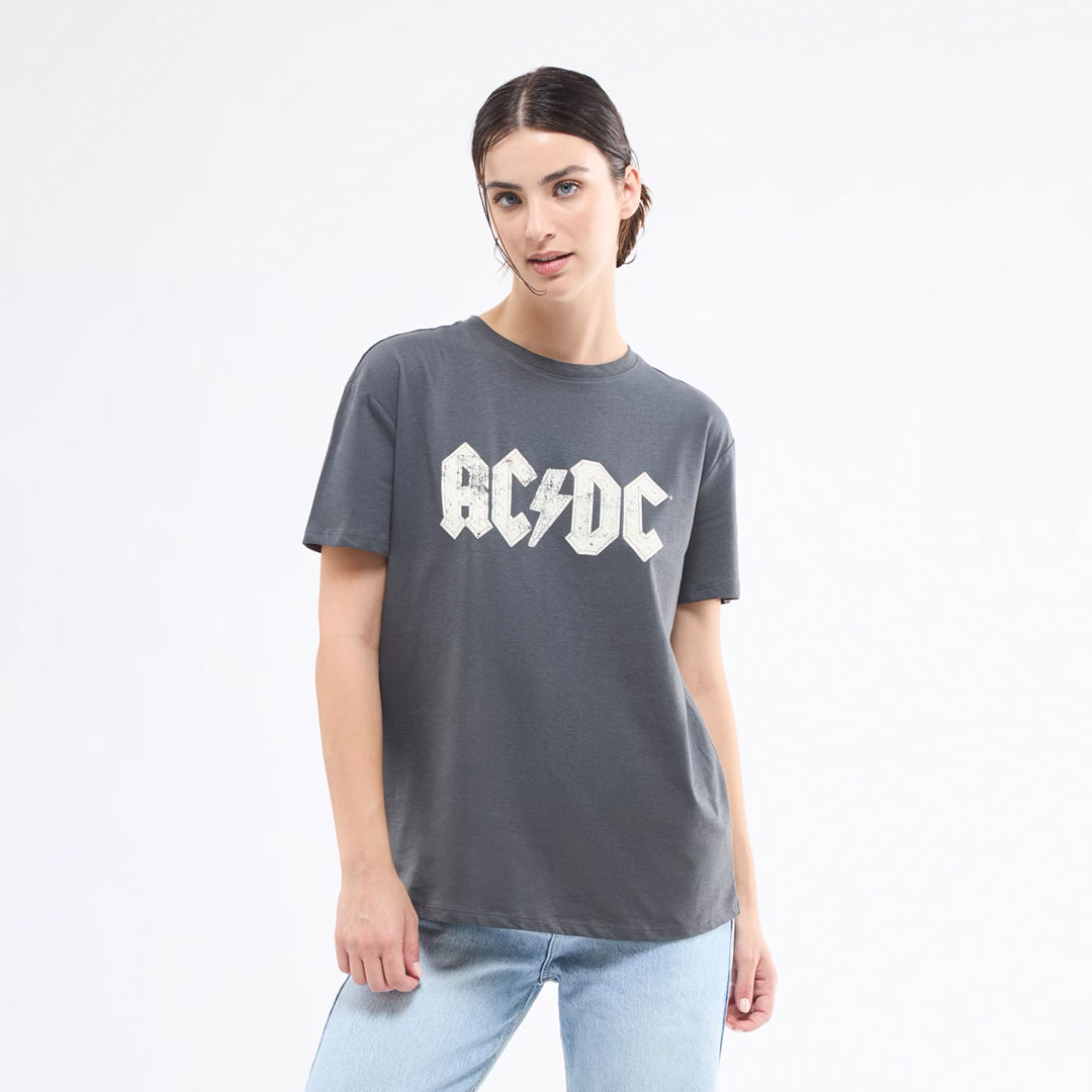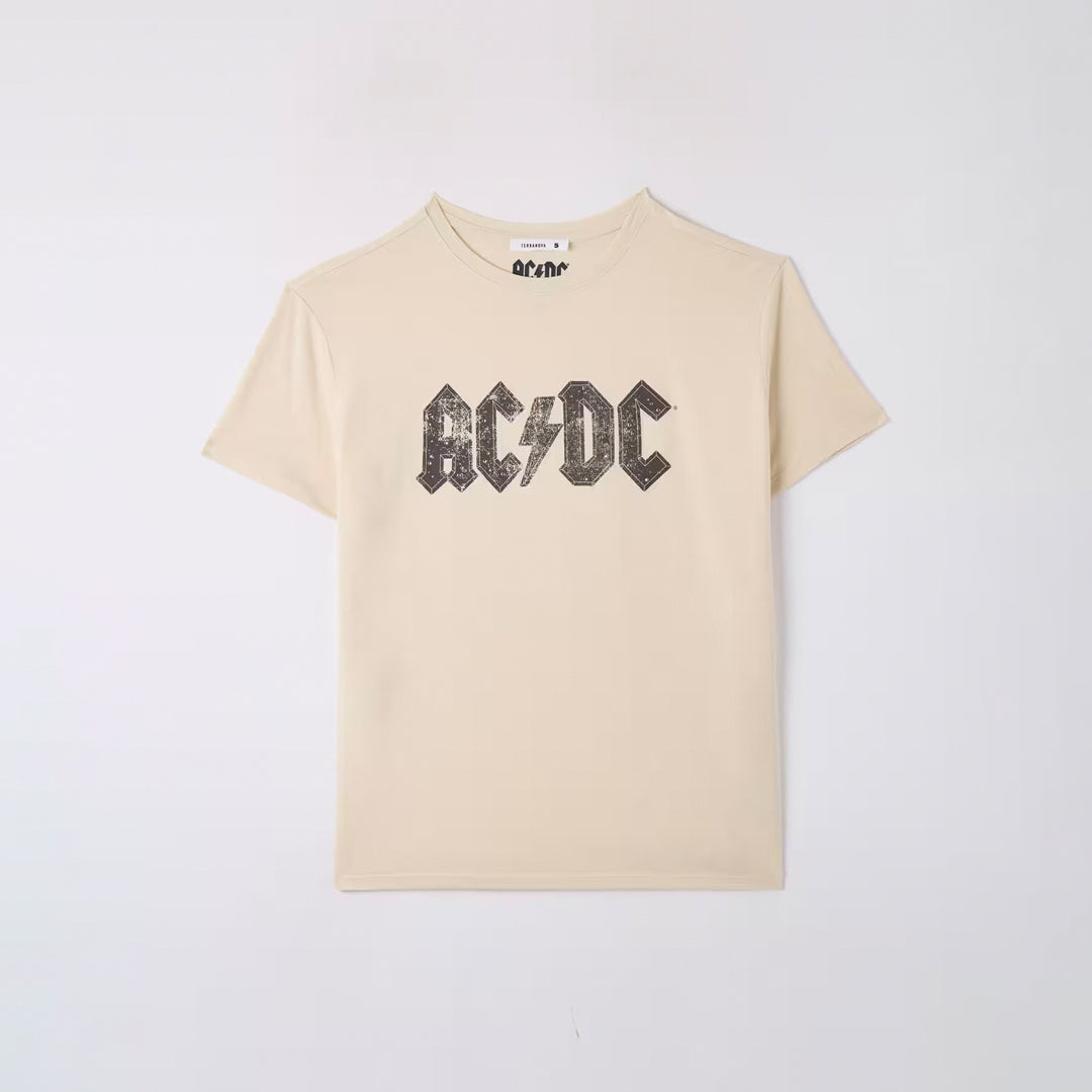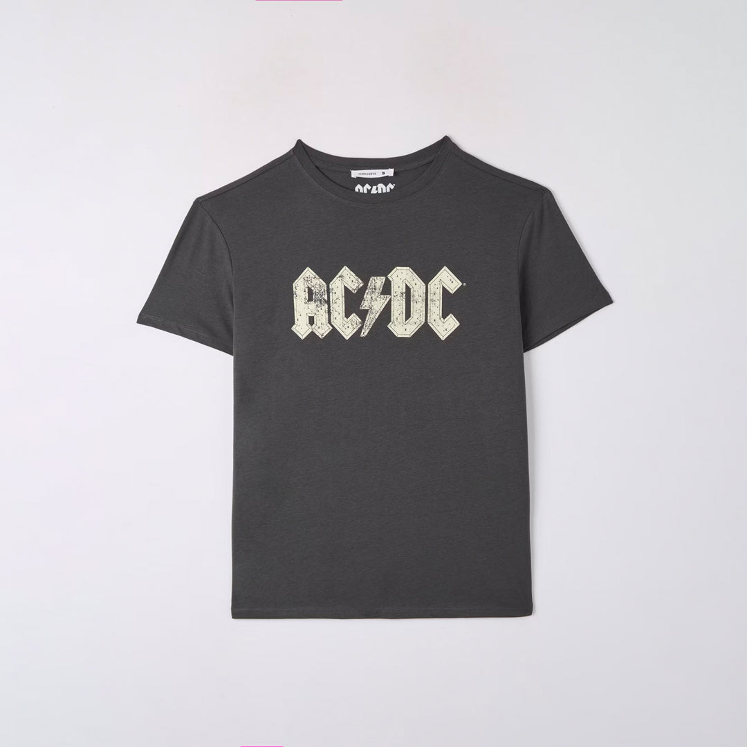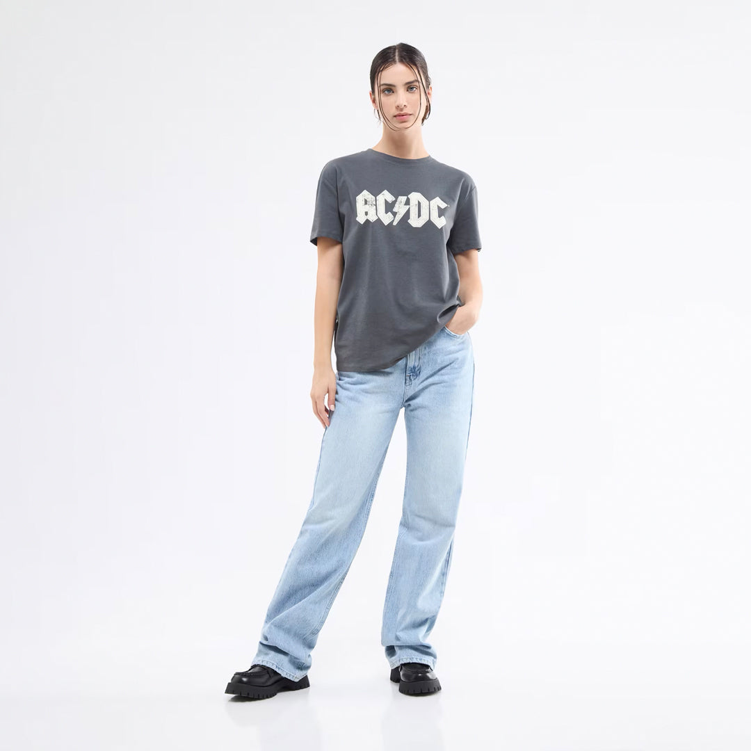 Women's crew-neck t-shirt with AC/DC print and rhinestone applications.