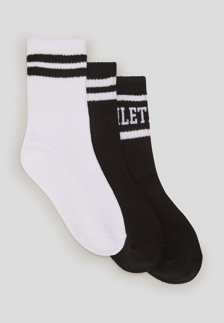 ● Children's socks ideal for sports and casual activities. ● Pack of three pairs, featuring contrast bands and decorative lettering. ● Perfect for completing dynamic and comfortable outfits, they fit sports shoes and sneakers. ● The standard length ensures a comfortable and practical fit for any occasion.