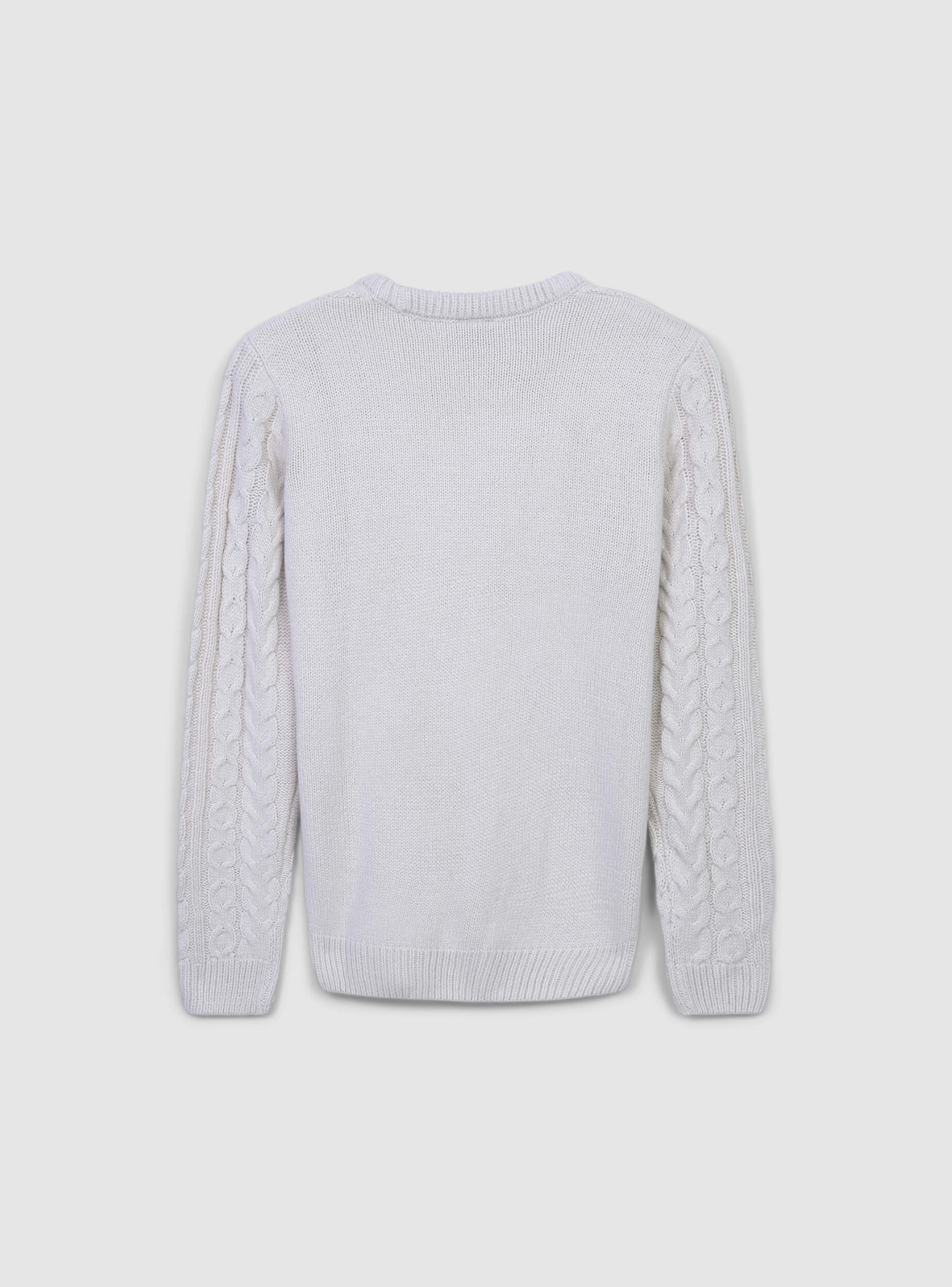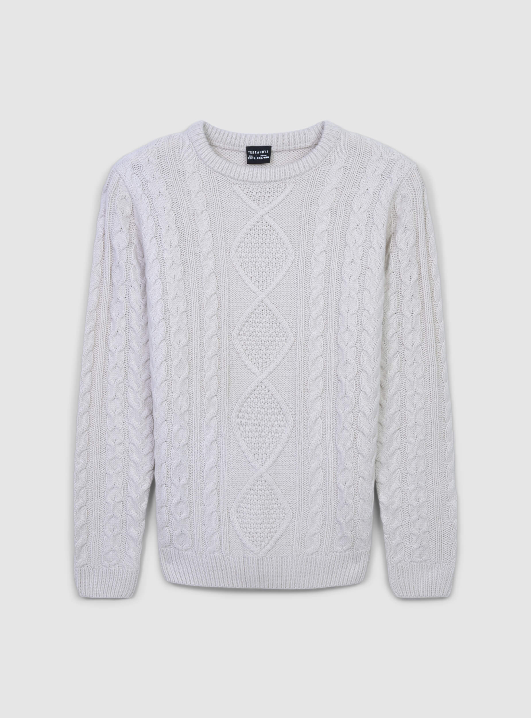 Featuring an intricate and traditional cable knit pattern, this sweater showcases vertical braids interspersed with diamond-shaped designs, creating a rich and visually appealing texture.
