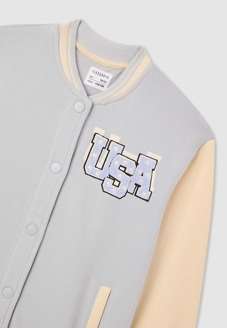 • Heavy fleece bomber jacket for girls with college prints on the front and back.