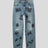 Children's jeans with a graffiti design, featuring writings and drawings in urban style distributed across the entire front surface, and details of rips.