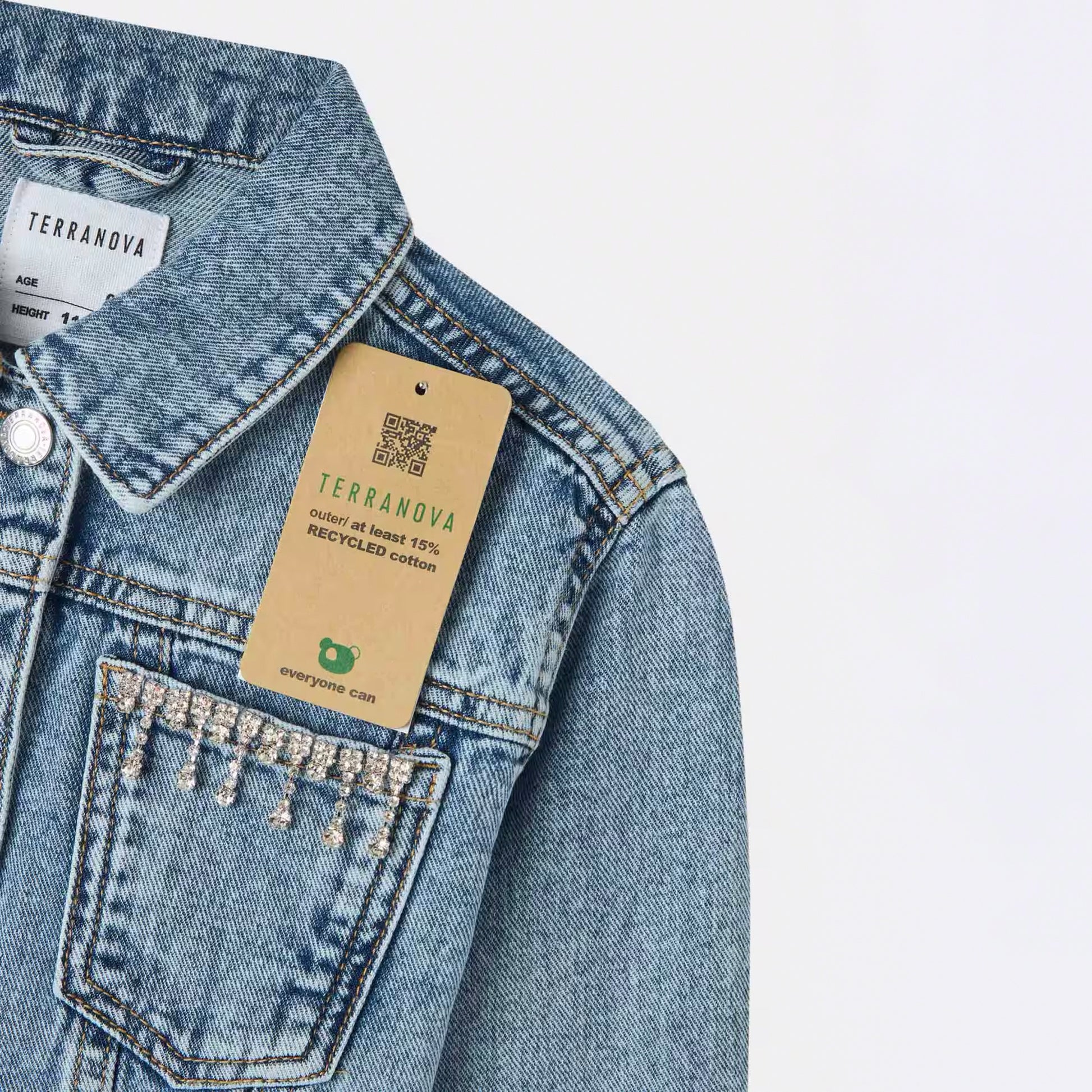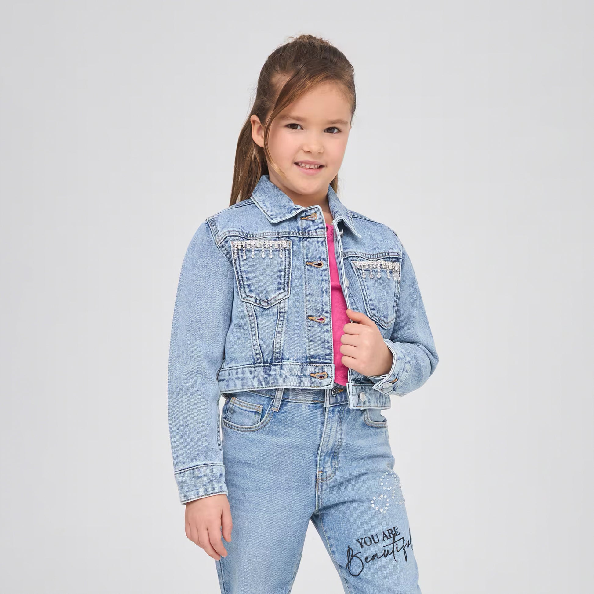 - Girl's denim jacket with front pockets with rhinestones.