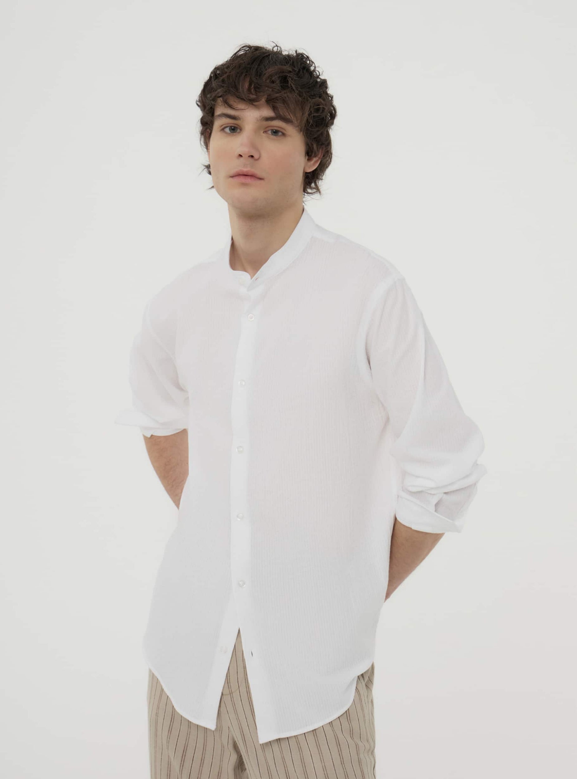 • Men's solid color cotton shirt. Long sleeves, mandarin collar and button closure.