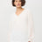 • V-neck model with long balloon sleeves featuring a ruffle detail on the cuffs.