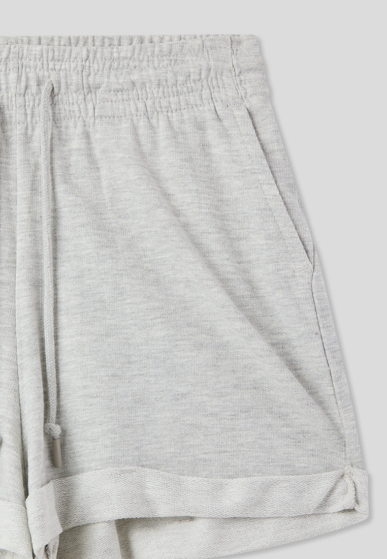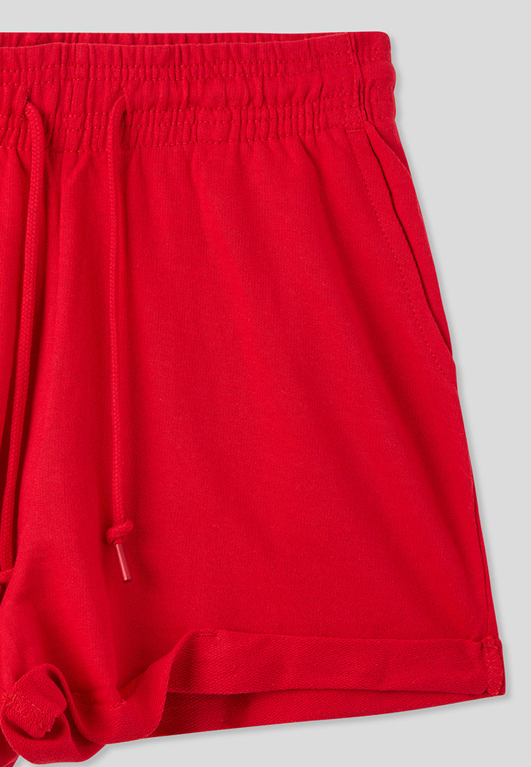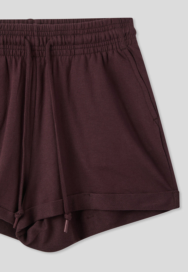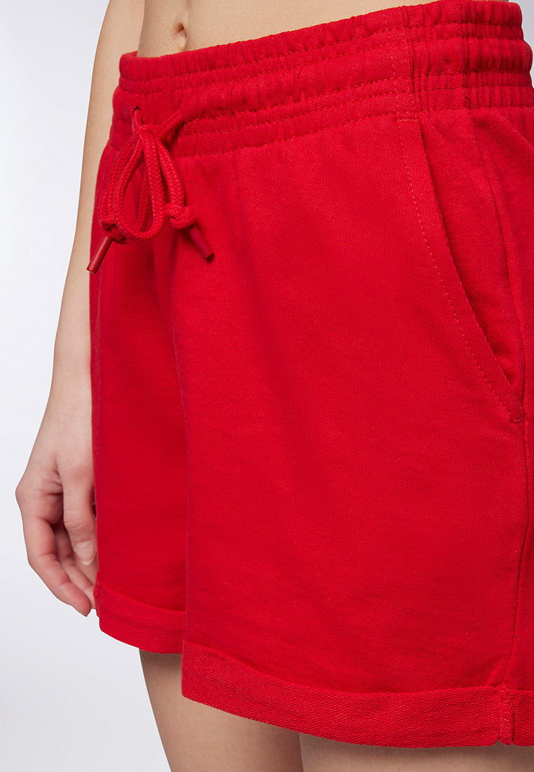 - High-waisted women's shorts in a solid colour, featuring a design with a cuff at the lower edge that adds a contemporary and refined touch.