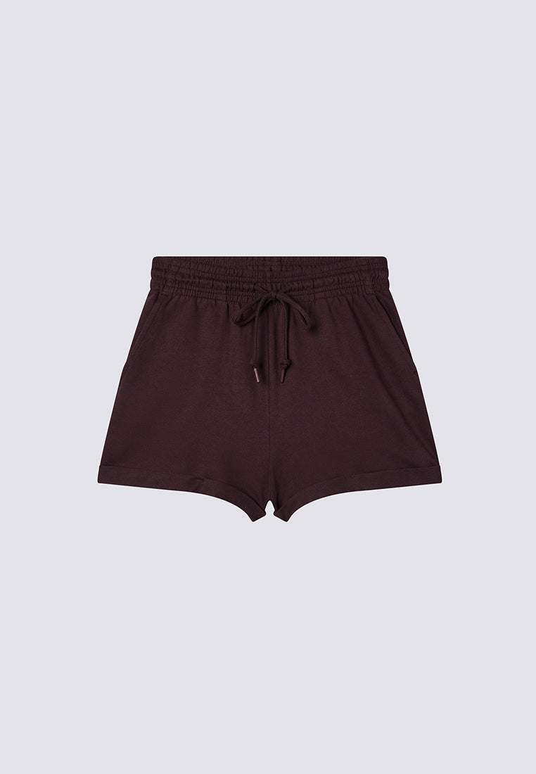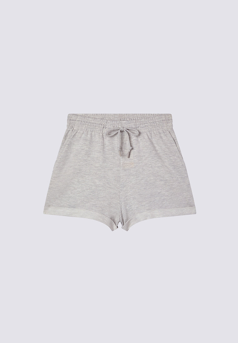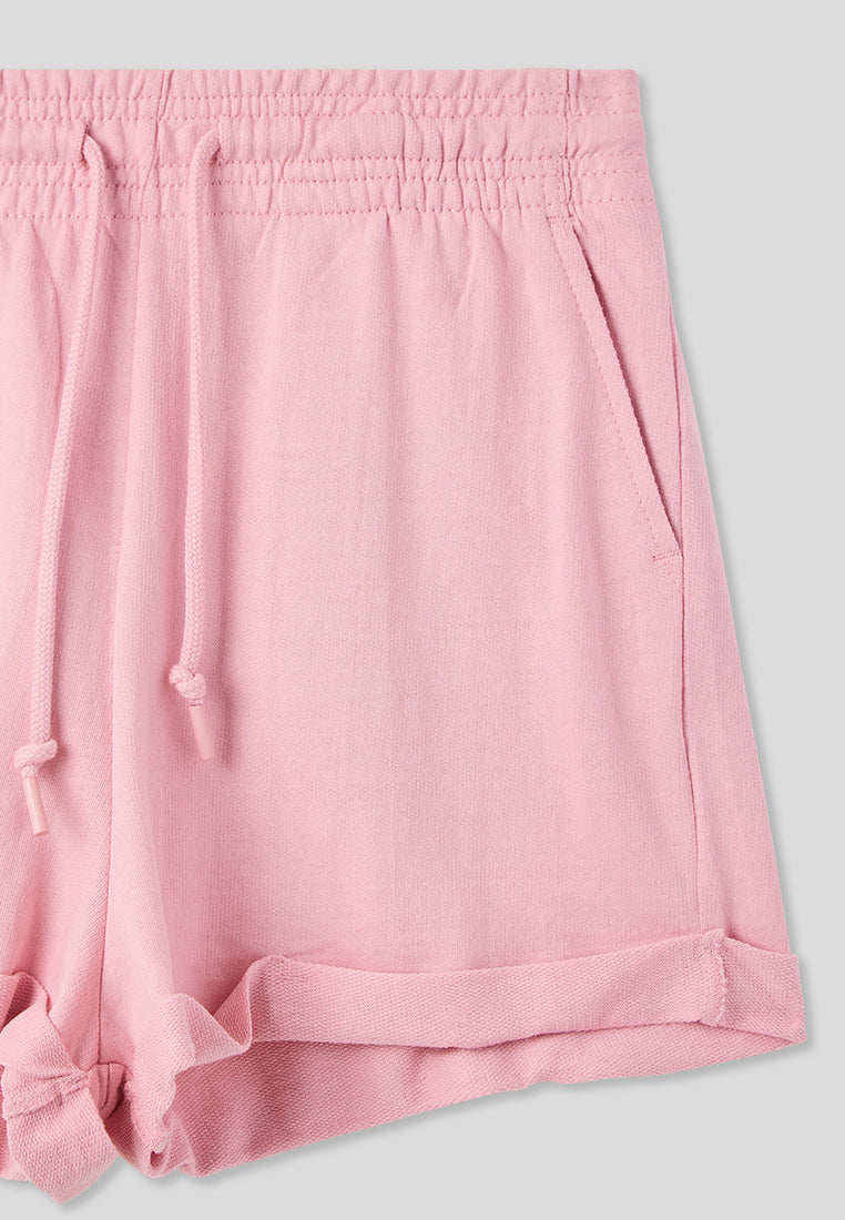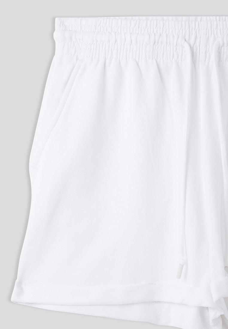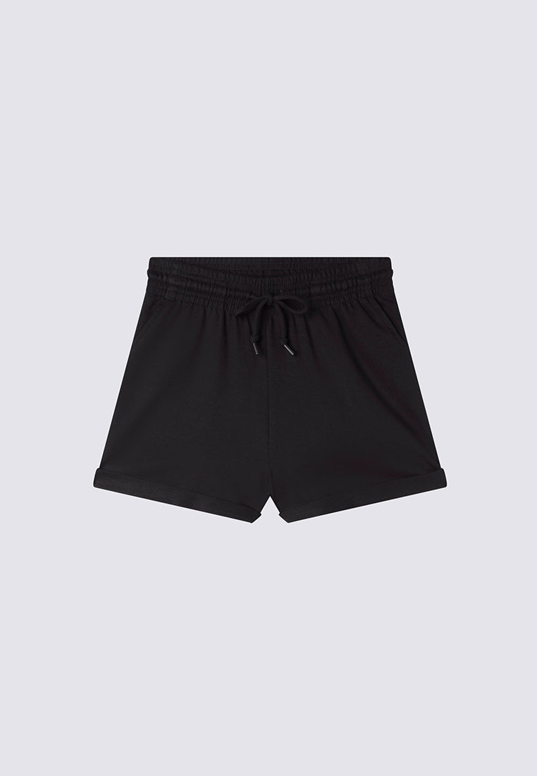 - High-waisted women's shorts in a solid colour, featuring a design with a cuff at the lower edge that adds a contemporary and refined touch.