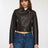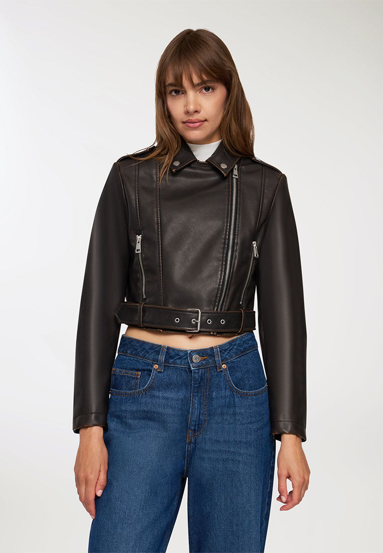• Women's jacket, biker style in vintage-effect faux leather, with long sleeves, diagonal zip and collar with a buttoned flap.