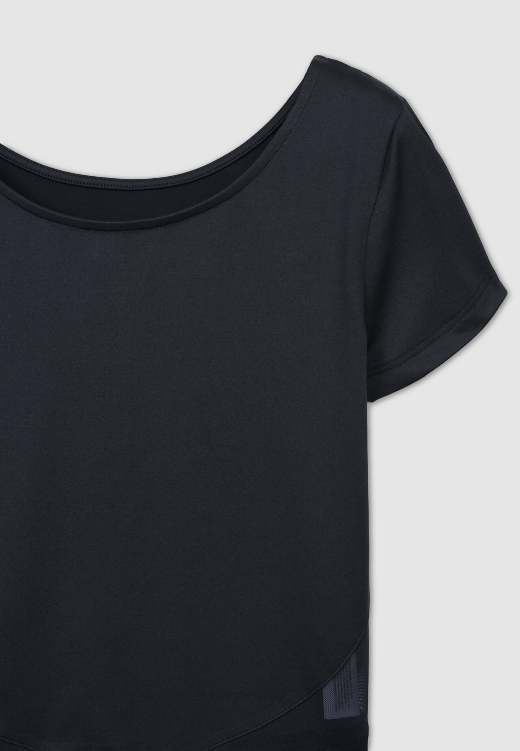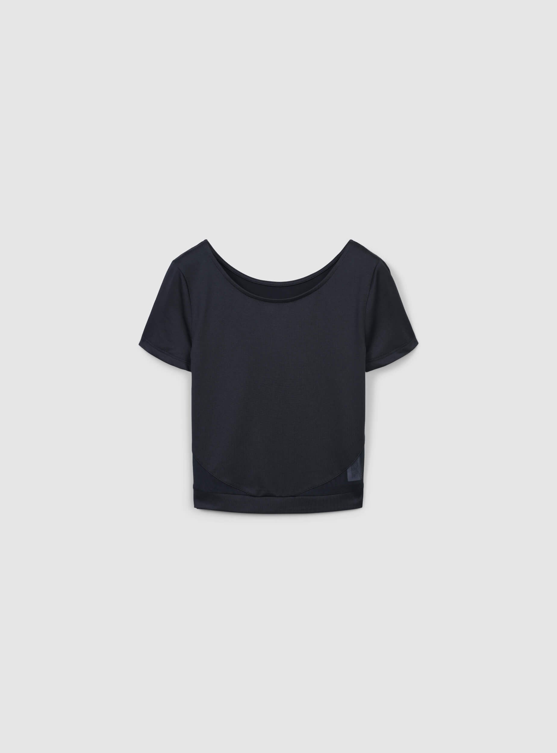 • The short sleeves and wide neckline enhance the silhouette, while the semi-transparent tulle detail adds a modern and feminine touch.