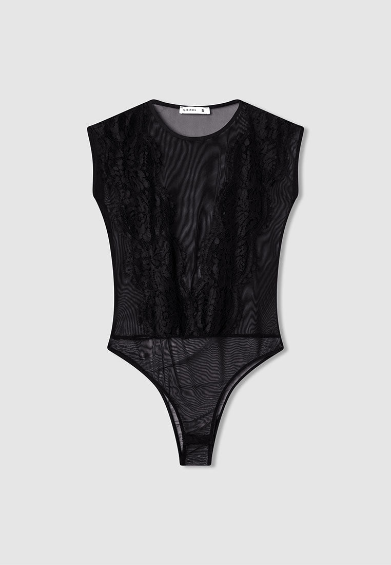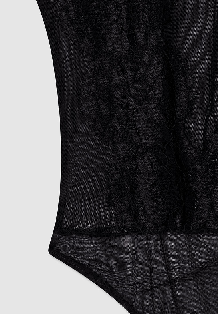 Refined and sensual women's bodysuit, characterised by an elegant lace insert that enhances the décolleté and adds a sophisticated touch to the look.