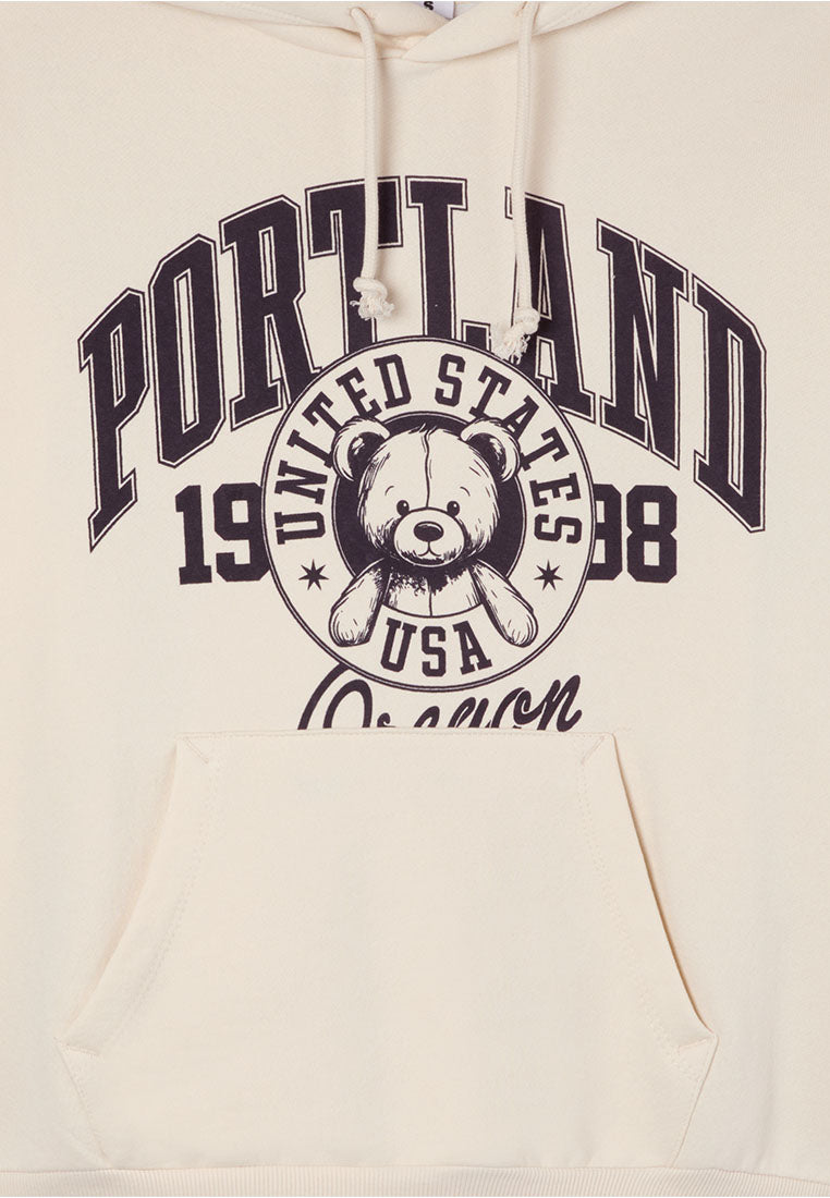 The maxi print "Portland Oregon" with college-style lettering and a lovely central bear adds an original and eye-catching touch.